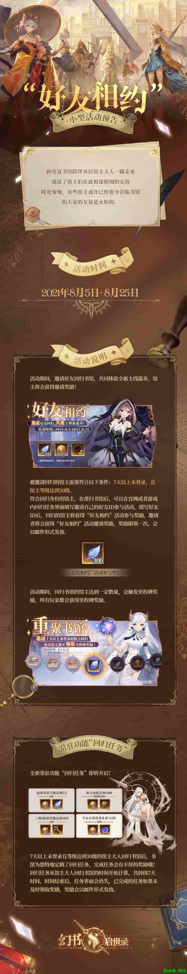一路走来,阿克夏书馆见证了馆主们彼此之间的友谊;时光荏苒,有些馆主忙于生活,已经很少再莅临书馆。为此,书馆特别开启“好友相约”限时活动,8月5日到8月25日期间,由在馆馆主邀请符合条件的好友馆主回归,共同体验全新主线篇章,还能触发里程碑奖励;回归任务“重聚书馆”将常驻于馆内,为符合条件的回归馆主特制小任务并赠予丰厚奖励。