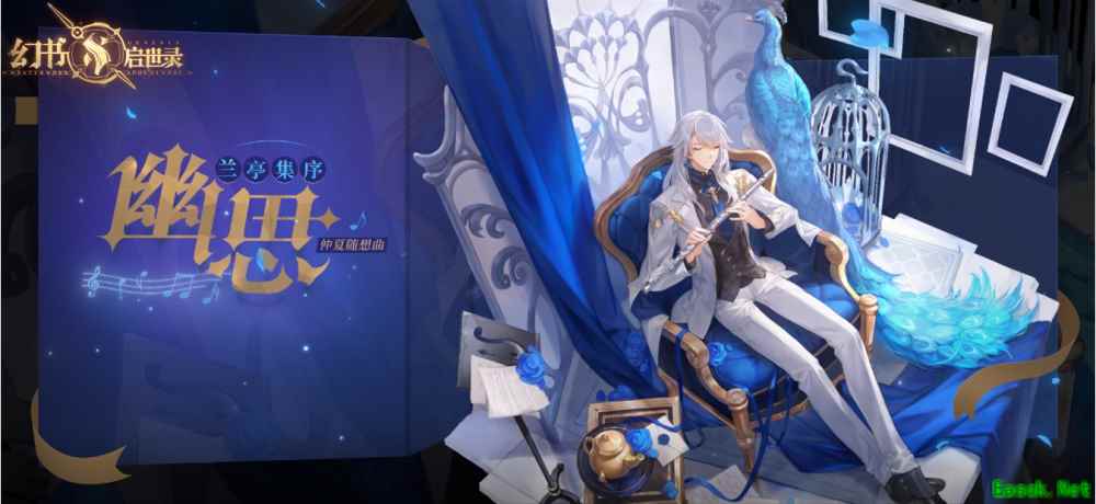 《兰亭集序》一头白发与身上的白色礼服相称,黑色的马甲勾勒出他的身形,身上的蓝色领带更为他添加一份帅气,在蓝孔雀的陪伴下,他手持长笛帅气温柔,这是献给仲夏夜的乐章。