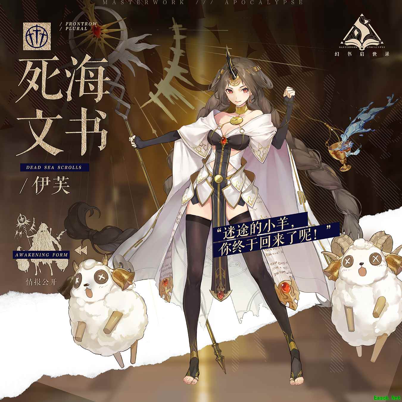 在《幻书启世录》中,「死海文书」化身为名为伊芙的少女。她继承了「死海文书」的意志,于她而言,看到别人的命运和行使奇迹并非难事。但正是因为拥有着如此强大的力量,她对这种能力始终持谨慎的态度,希望世界能够沿着正常的轨迹运行。