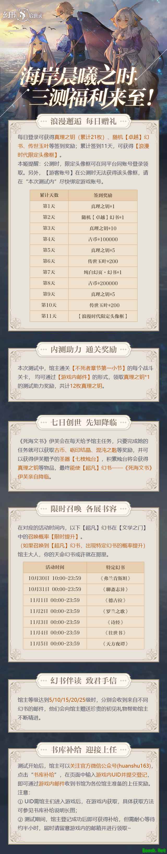 本次测试,还为馆主准备了超多三测福利,每日登录即可获得真理之钥、随机【卓越】幻书、传世玉叶等签到礼,累计签到11天,还可获得浪漫时代限定头像框!
