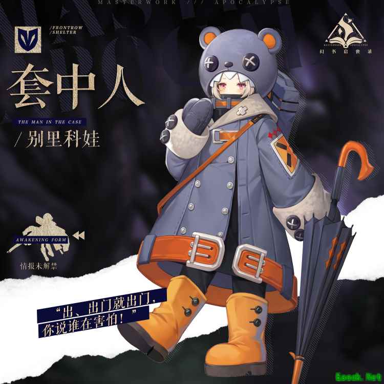 继承了《套中人》意志的别里科娃也拥有着异于其他幻书的个性。于她而言,这个光怪陆离的世界上充斥着形迹可疑的古怪人类,以及各式各样带来伤害的陷阱。因而,当其它幻书努力学着与这个世界打交道时,她却选择将自己裹在层层的套子之中。而这套子,则是她最为坚固的壁垒。