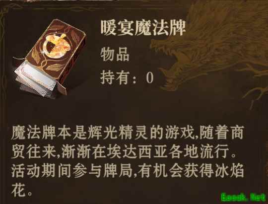 【暖宴牌局】的传统源于辉光精灵一族。每当凛冬将至、风雪弥漫之时,这些优雅的生灵便会聚集在温暖的篝火旁,一边分享美食,一边进行充满智慧与趣味的魔法牌局游戏。这种兼具社交与娱乐的活动,不仅帮助他们驱散了冬日的严寒,更成为了文化传承的重要纽带。随着埃达西亚大陆各区域间商贸往来的日益频繁,这一富有魅力的活动也逐渐流传开来,风靡各地。如今,埃达西亚的朋友们也向所有旅者发出诚挚的邀请,期待大家的加入,共同围炉欢聚~