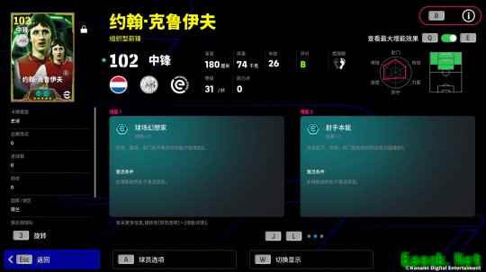 克鲁伊夫增能属性为【球场幻想家 +2】,盘球和控球增强让他盘控自如,配合特殊技能【无定型传球】,他能在身体失衡的瞬间送出一脚关键的助攻,帮助队友完成破门!