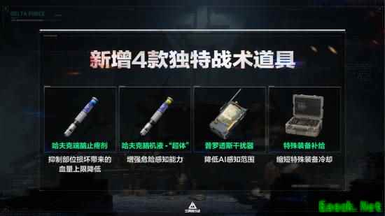 而在战术道具部分,新增了4款特殊的战术道具。哈夫克端脑止疼剂可抑制部位损坏带来的血量上限降低;哈夫克脑机液-“超体”可增强危险感知能力;普罗透斯干扰器可降低AI索敌距离;特殊装备补给—可大幅缩短技能冷却,为各位干员带来了更多策略选择。