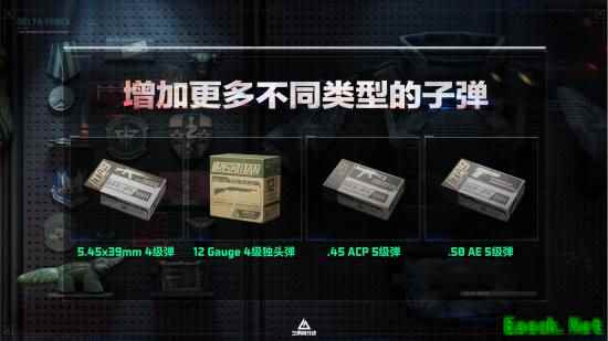 在子弹类型部分加入了5.45x39mm 4级弹加强版、12 Gauge 4级独头弹加强版、.50 AE 沙鹰5级弹、 .45 ACP5级弹等,带来不同的攻防体验。当然了,这些在属性上颇有吸引力的子弹是在军需处限购的,无法上架交易。