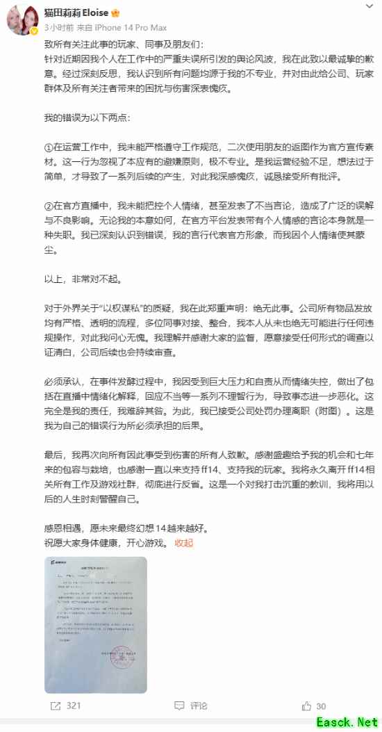 随后,猫田莉莉本人也在微博发布了道歉信,对由此给公司、玩家群体及所有关注者带来的困扰与伤害深表愧疚。