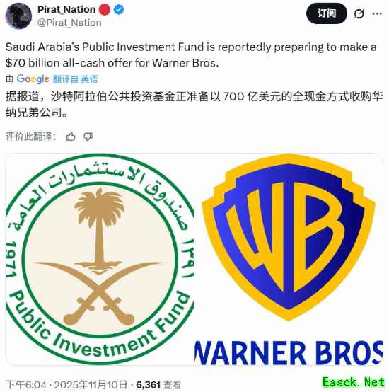 有传闻称,沙特阿拉伯公共投资基金正准备以700亿美元全现金收购华纳兄弟探索公司。