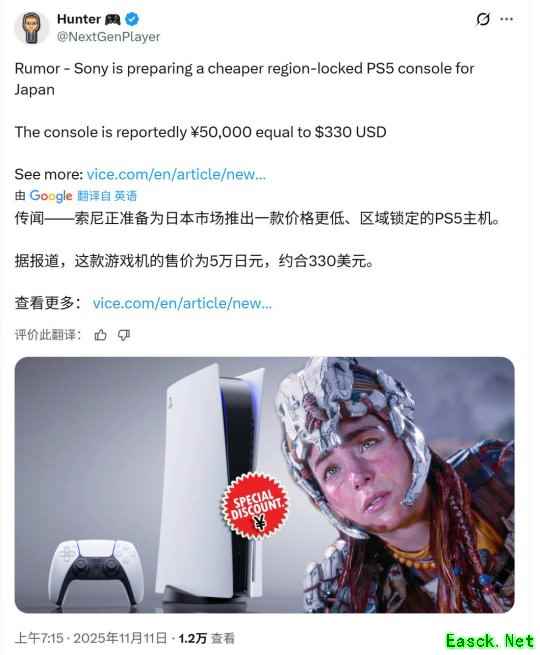 这条爆料最早于11月初出现在各大硬件论坛上。传闻称,PlayStation将发布一款仅在日本发售的新款PS5。一位InstallBase论坛用户写道:“听说索尼可能会在11月21日推出一款售价5万日元的日本锁区版PS5数字主机。”