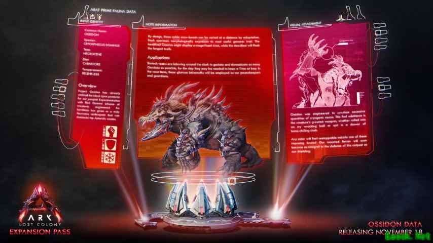 《方舟:生存飞升》即将上线坏死纪时代生物“奥西顿”,作为被红元素改造的食肉巨兽,能够分泌低温粘液作战,并于太平洋时间11月18日登录。古章鱼(Paleoctopus)以超 2.3 万票当选,将成为《方舟:生存飞升》“创世纪 Part 1” 的新增生物。《方舟:失落禁域》的故事将通过多种形式呈现:包括配音的探险者日志、图鉴、全新的“记忆印痕法典”、角色对话场景再现方舟历史事件、CGI 与 MAPPA 动画、自我叙述以及游戏实机流程等多重方式。探险者日志的预览片段已上线,描绘了他在《灭绝》事件之后的挣扎。