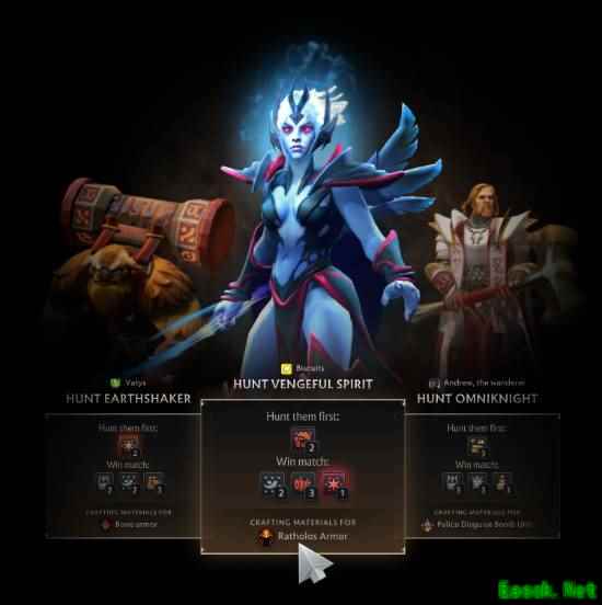 在每场Dota比赛开始时,你可以选择一名敌方英雄,作为狩猎的目标。不同的英雄会奖励不同的打造材料。每个潜在目标都会列出材料以及这些材料用来打造的套装。可以根据接下来要打造的套装来选择提供特定材料的目标。如果赢下比赛,将会获得列出的所有材料。如果失败,只会获得其中的一部分。