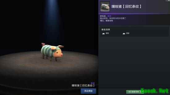 噗吱猪包括基础款在内,拥有6套可打造的外观,包括回忆条纹、见习调查员、嗡嗡嗡小蜜蜂、南瓜之逆袭、魅惑粉红、国王的新衣。