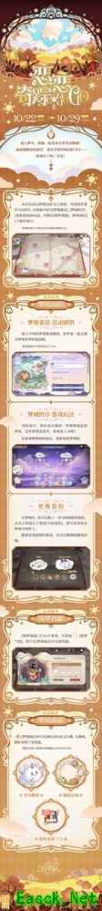 10月22日09:30 - 10月29日05:00,通过[主界面]右下角-进入[恋恋奇踪·曜恋狮原],和罗夏一起探索梦中世界。参与活动可获得活动自定义头像、头像框、限时老荷兰等奖励。