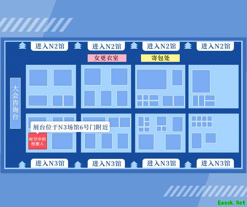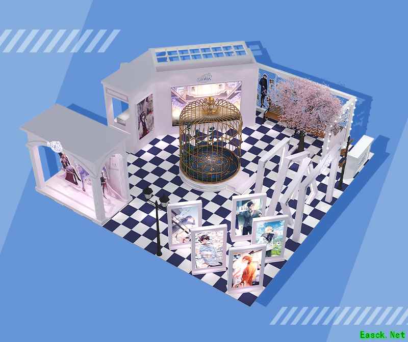 《时空中的绘旅人》展位位于N3场馆6号门附近。参加过内测的小伙伴应该对展台中心场景十分熟悉,这就是游戏开篇“荆棘鸟笼”的实地场景!各位玩家可以自行进入其中拍照留念。除鸟笼外,现场还融合画廊、画框等游戏元素搭建了签到、抽奖、体验、周边、签绘五大功能区,希望能给前来展台的玩家沉浸式的体验。