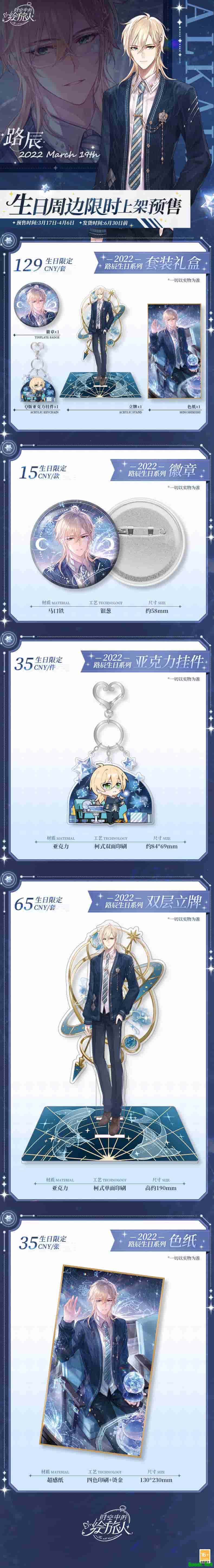 3月17日19点起至4月6日24点,2022年路辰生日限定周边预售开启,将于天猫《时空中的绘旅人》旗舰店进行发售。此次预售周边包括路辰生日马口铁徽章、路辰生日双层立牌、“宇宙青鱼”金边色纸、“宇宙青鱼”Q版亚克力挂件,购买路辰生日周边系列套装(内含前述商品各1)可获得精美礼盒。活动期间领取商品券后下单,还可享受相关包邮满减优惠。