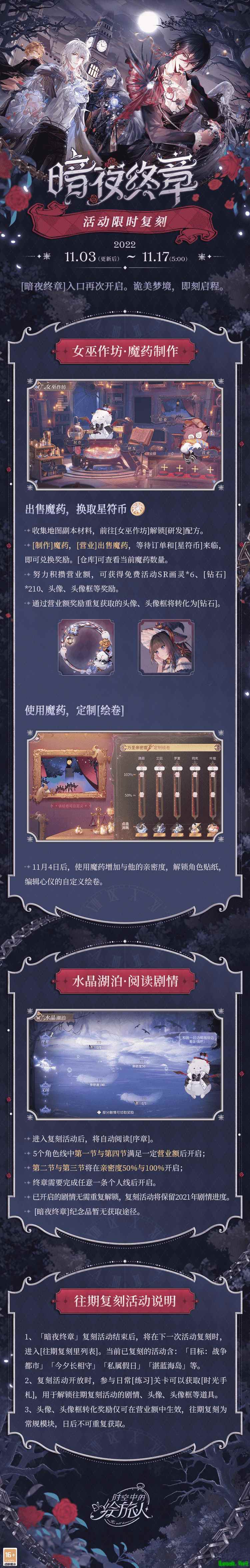 11月3日更新后 - 11月17日05:00,点击[花架]-[暗夜终章]可进入活动复刻玩法。复刻活动开启后,前往[水晶湖泊]查看活动剧情,部分剧情满足一定条件后开启。收集地图副本材料,前往[女巫作坊]研制魔药,经营作坊赚取[星符币]。