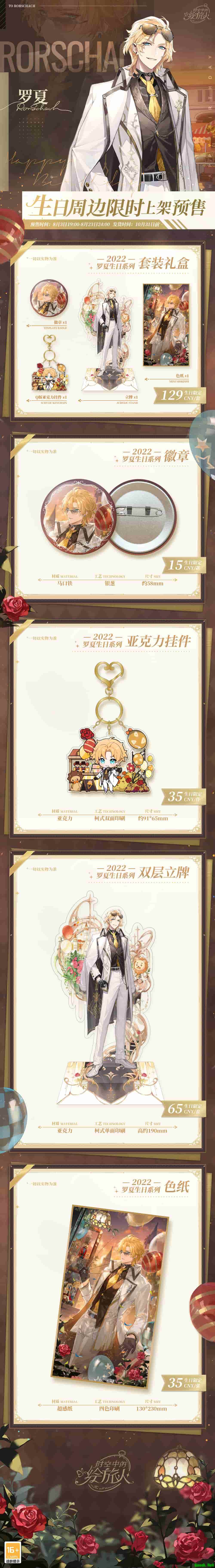 8月3日19点至8月23日24点,罗夏生日限定周边将于天猫<时空中的绘旅人>旗舰店发售。此次预售周边包括罗夏生日马口铁徽章、双层立牌、“恒河沙数”金边色纸、“恒河沙数”Q版亚克力挂件及罗夏生日周边系列套装(内含前述商品各1)。购买周边可享受满99元包邮及相关满减优惠。