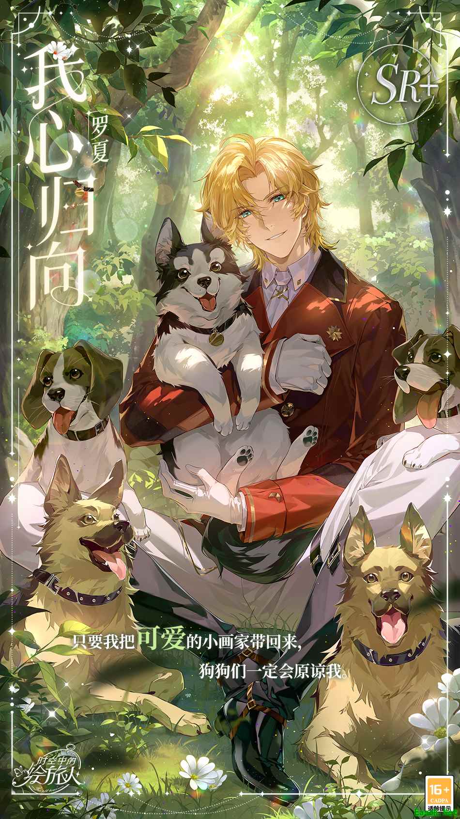 被扑倒在地的罗夏拥住了热情的猎犬,阳光打在他深邃的面容上。