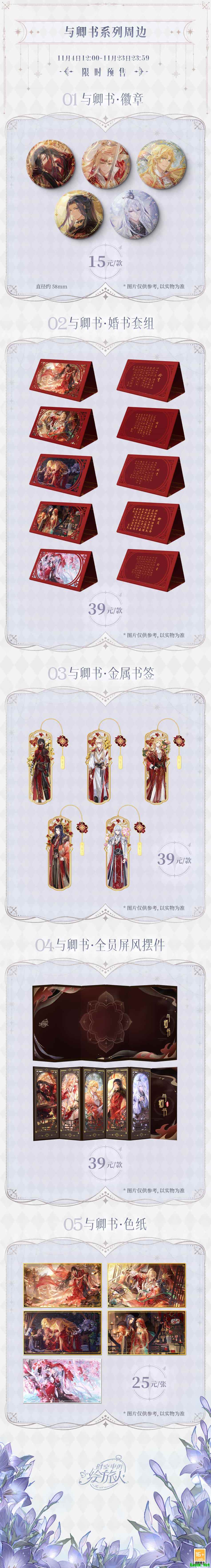 本次预售周边包括 「与卿书」系列徽章、色纸、金属书签、屏风摆件、婚书组合;「诸界归一」系列链条徽章、色纸、流沙摆件、透卡、明信片、收藏卡、拍立得、冰箱贴;「周年盛典」系列:蛋糕组合立牌。