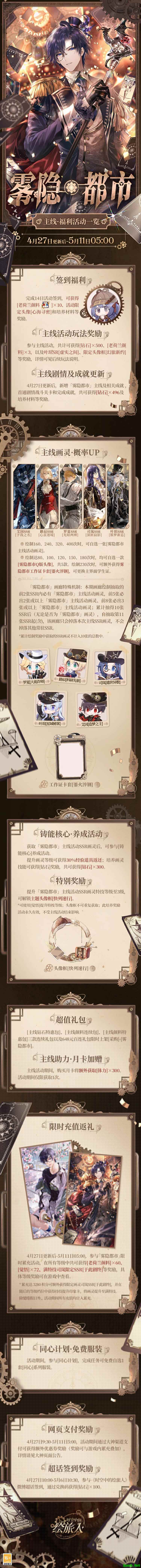 4月27日更新后 - 5月11日05:00 ,「雾隐都市」限时返利活动开启,累计充值达对应积分,可获得司岚SSR[于此剧终]、[老荷兰颜料]、[觉悟]等奖励。主线卡池绘制机制和奖励特别升级,可在不同绘制奖励档位中分别获得:雾隐都市画灵自选[雾隐都市礼盒]、[雾隐都市Q版头像]、雾隐都市工作证卡套[鎏火淬钢]等奖励。获取「雾隐都市」主线画灵后,参与[铸能核心]养成活动,可获得经验道具返还。培养画灵特技,可获得限定头像框。