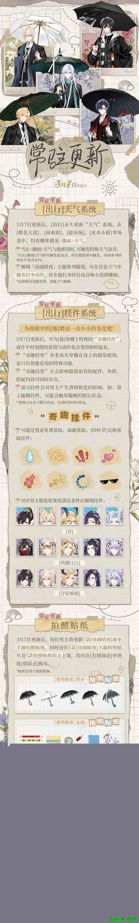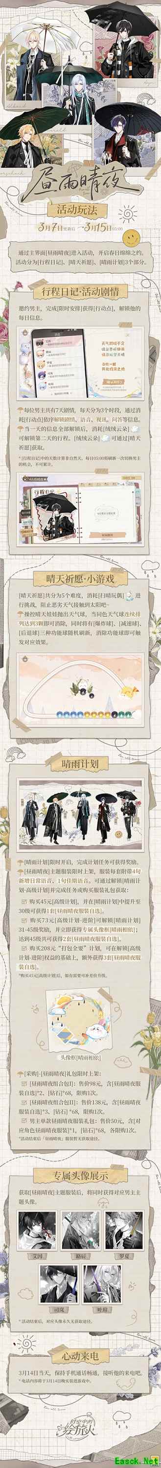 3月7日更新后 - 3月15日05:00,全新活动「昼雨晴夜」主题服装上架。获取服装后,将同时获得对应男主的专属头像。