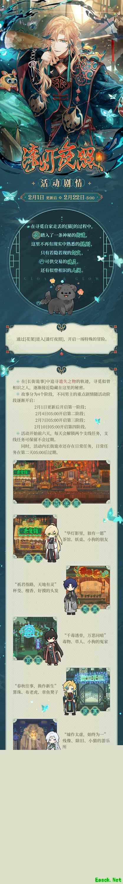 2月1日更新后 - 2月22日05:00,「漆灯夜照」卡池、许愿功能限时开启。活动期间,艾因SSR[执迷蛊心]、路辰SSR[冥逢幽路]、罗夏SSR[尽处天光]、司岚SSR[六出诡事]、叶瑄SSR[人间不识]获得概率提升。