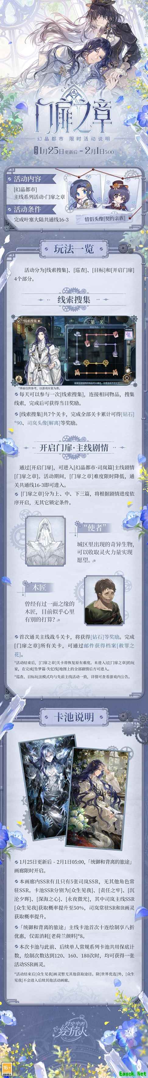 《时空中的绘旅人》「幻晶都市」全新主线司岚篇[门扉之章]将于1月25日更新后开启。接连往今,虚实浮沉,启封矗立的门扉,探求未来的可能。