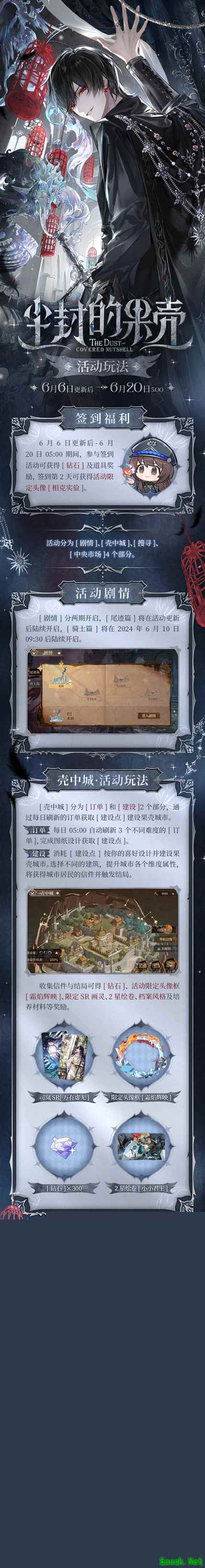 6月6日更新后 - 6月20日05:00,「尘封的果壳」活动开启。参与活动[壳中城]玩法,可免费获得司岚SR[万有虚无]。