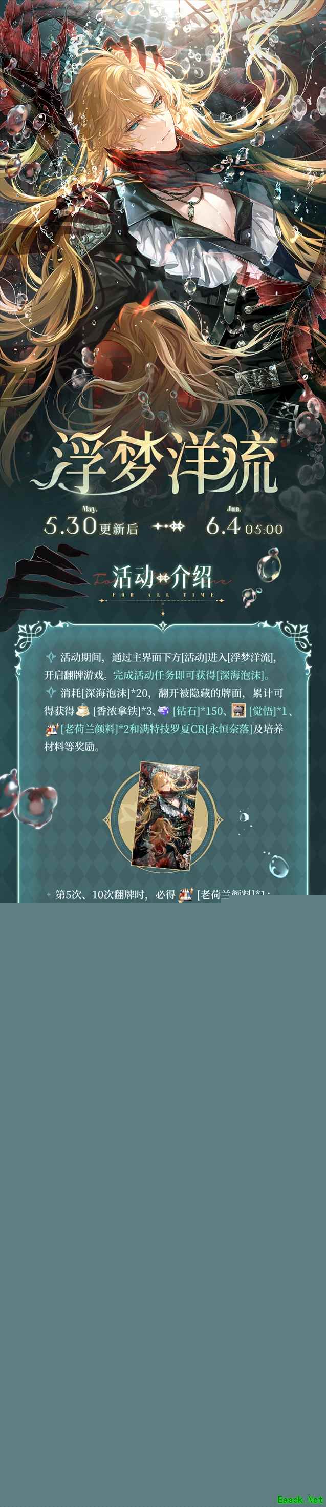 5月30日更新后 - 6月4日05:00,通过主界面下方[活动]进入「浮梦洋流」。完成活动任务或购买礼包获取[深海泡沫],消耗[深海泡沫]翻开被隐藏的牌面,可得[钻石]、[觉悟]、[老荷兰颜料]和罗夏CR[永恒奈落]等奖励。