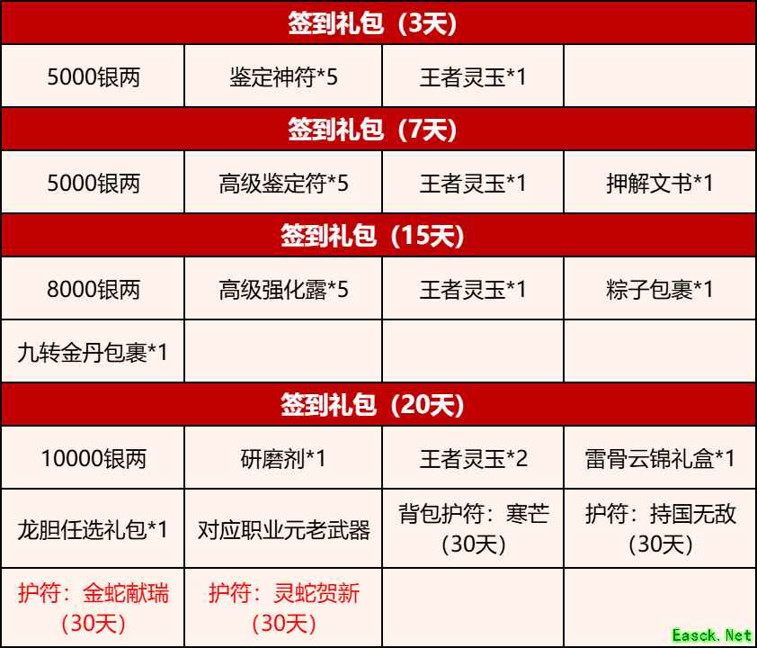 签到20天还能获得超多护符奖励,包含背包护符:寒芒(30天),护符:持国无敌(30天),护符:金蛇献瑞(30天),护符:灵蛇贺新(30天)。