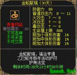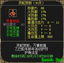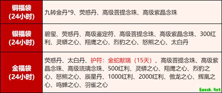 礼包包含以下内容:高级菩提念珠*1、高级紫晶念珠*1、高级琉璃念珠*1、傲龙之心*1、王者灵玉*1、护符:灵蛇贺新(15天),40级以上角色激活,同样需要前往瓦当镇NPC礼品专员处激活。