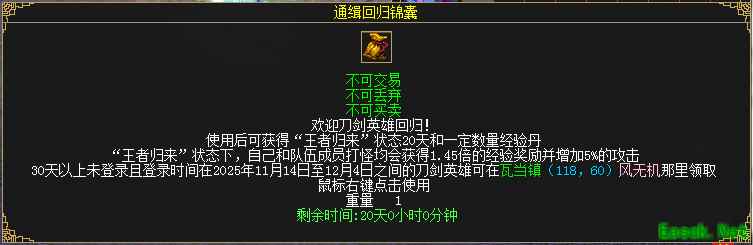 11月14日09:00至12月4日24:00期间,“老友通缉令”名单上的稻米,或超过30天未登录游戏的80级以上稻米,登录游戏后可前往瓦当镇(118,59)风无机处,分别领取“通缉回归礼包”和“重归经典厚礼”。