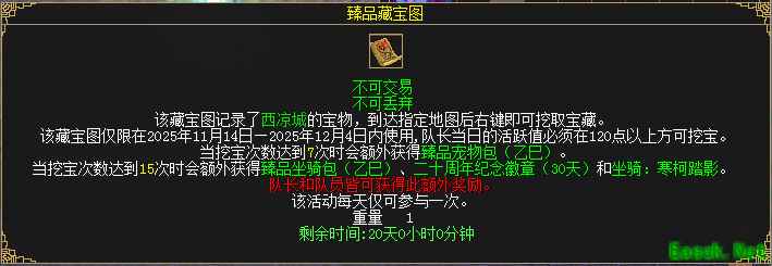 符合条件的玩家每日可前往西凉城(100,154)NPC张岩处领取1张藏宝图,老友右键藏宝图即可挖宝。每次开启藏宝图两人必得1000银两,30%几率获得稀世宝箱,70%几率获得精致宝箱。所有玩家累计挖宝7次即可额外获得臻品宠物包(乙巳),累计15次可获得臻品坐骑包(乙巳)、二十周年纪念徽章(30天)和坐骑:寒柯踏影好礼!