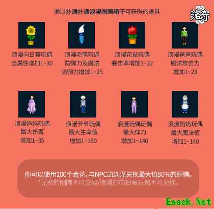 每次使用[爱之浪漫纪念箱]时会获得[扑通扑通浪漫农场选择箱兑换券]。如果收集到100张可以带给NPC凯连泽长老兑换成[扑通扑通浪漫农场选择箱],使用时可以选择获得任意一项能力值的浪漫农场迷你樱花装饰。