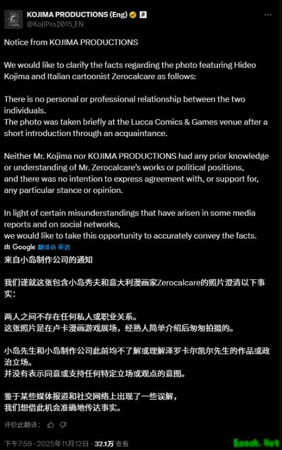 针对这一事件,小岛工作室发表声明表示相关照片是在意大利一个展会上,经人介绍后短暂寒暄时拍摄的,声明强调,小岛秀夫与Zerocalcare之间不存在任何私交或合作关系。工作室及小岛本人事先也并不了解对方的作品内容或政治立场,发布照片并无表达任何政治立场、主张或支持的意图。