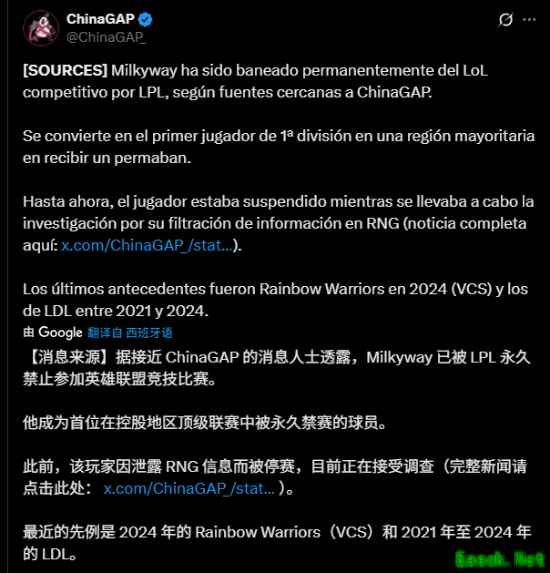 近日根据外媒爆料称,一位消息人士透露,Milkyway选手现已被LPL赛区永久禁止参加《英雄联盟》电竞比赛,这也是首位在主流赛区顶级联赛中被永久禁赛的选手。