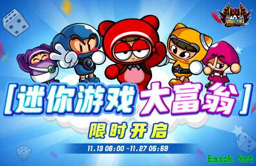 本次更新后,11月13日06:00 ~ 11月27日05:59,<迷你游戏跑跑大富翁>限时开启。在11月13日 ~ 11月19日每日18:00 ~ 21:00在线每满60分钟,可分别领取“[活动]时间沙漏(3个)”!