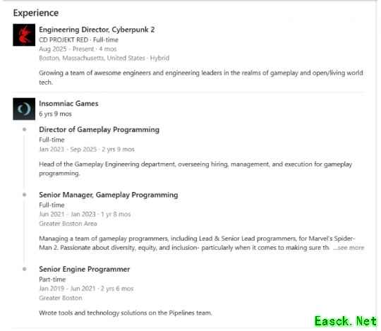 根据领英上的信息,Jess将领导一支工程师团队,在CD Projekt Red波士顿分部开发《赛博朋克2》。这位总监此前曾在Insomniac Games工作近7年,参与开发了多个系列经典游戏。