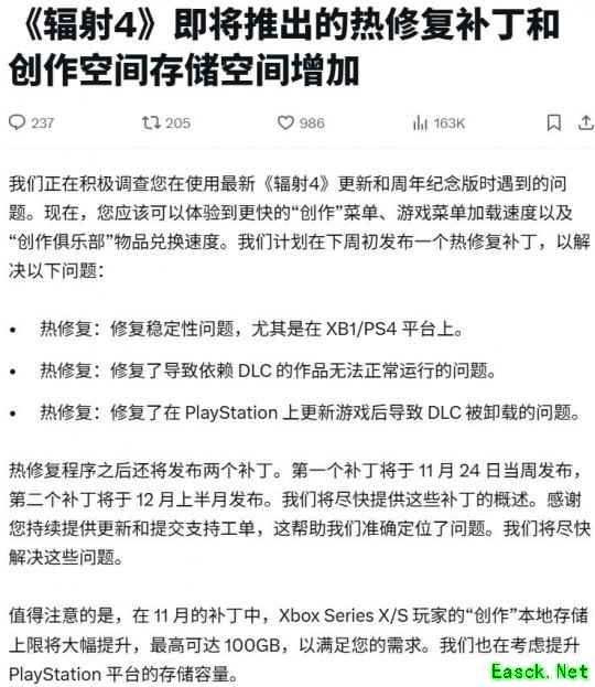《辐射4》周年纪念版的开发商贝塞斯达工作室(B社)宣布将发布一系列补丁,旨在解决该纪念版所面临的批评。首个补丁预计将于下周发布,主要解决几个关键问题:加快Creation Club内容的加载速度、提升上世代主机平台的稳定性,并修复扩展包中模组相关的问题。