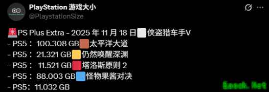 11月13日,索尼公布了PS Plus二/三档会员游戏。推主PlayStationGameSize透露了部分游戏的容量大小,准备游玩的朋友提前准备好空余的存储空间哦。
