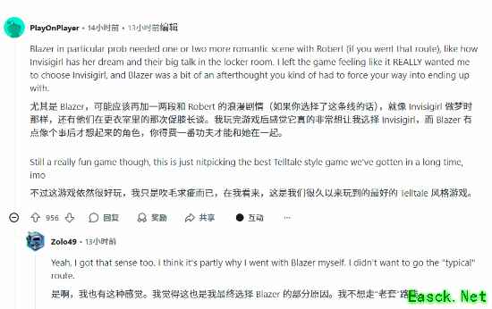 一位网友指出:“特别是 Blazer,可能需要与罗伯特多一两个浪漫场景(如果你选了这条线),就像 Invisigirl 有她的梦境和在更衣室的大型谈话一样。”