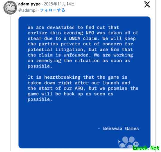 Beeswax Games工作室日前回应称,旗下游戏《无人在线》因被告知违反DMCA版权法而被Steam平台下架,工作室强烈反驳游戏并没有违反版权法的事实依据,目前正在积极应对中,争取早日回归。