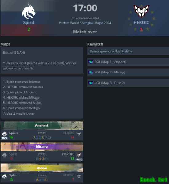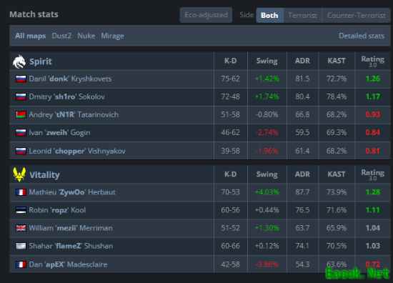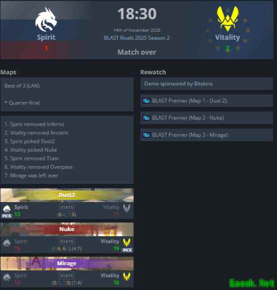 昨日,在中国香港举行的《反恐精英2》BLAST Rivals四分之一决赛上,今年IEM科隆冠军Spirit和最新大满贯得主Vitality贡献了一场酣畅淋漓的对决,双方最强选手donk和ZywOo均有亮眼发挥,最终小蜜蜂让一追二逆转晋级。