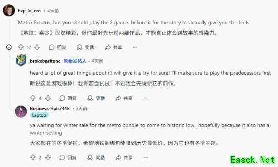 不少玩家都提到了帖子配图中的游戏,例如一位玩家就为《地铁》系列点赞,指出《地铁:离去》十分精彩,但你最好先玩《地铁》系列前两作,才能真正感受到本作的感染力。