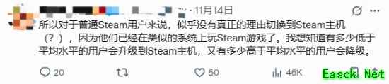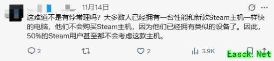 11月14日,推特用户@lextorias发文表示:我觉得很多人都没意识到,Valve 实际上只是根据 Steam 硬件调查中最常见的结果,就设计出了一台游戏主机。Steam Machine的本质就是这样。
