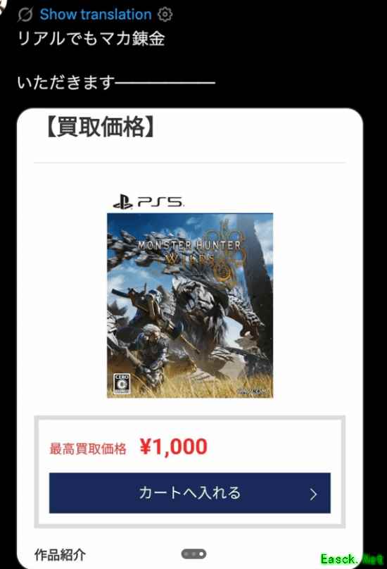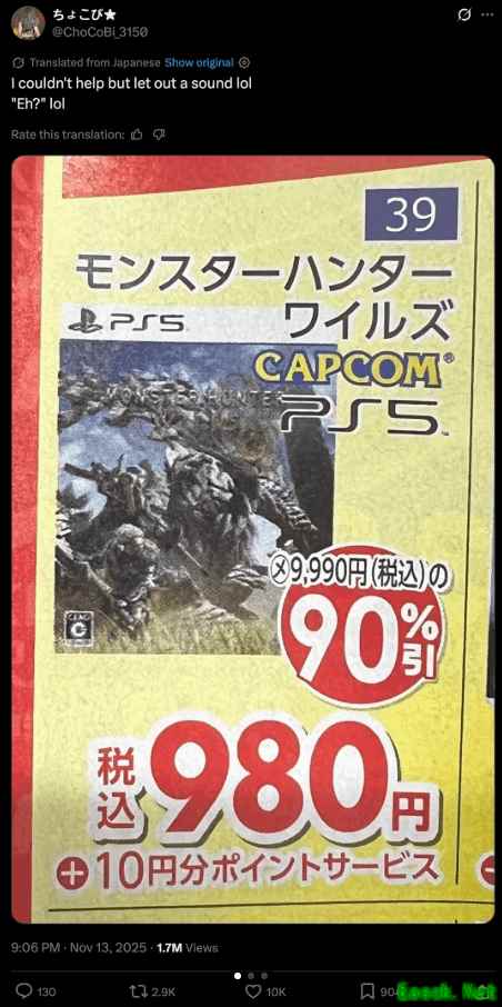 近日Reddit论坛上有网友收集了日本一些游戏实体店里《怪物猎人荒野》PS5光盘打1折的现象!原价9900日元定价的PS5光盘只需要990日元……