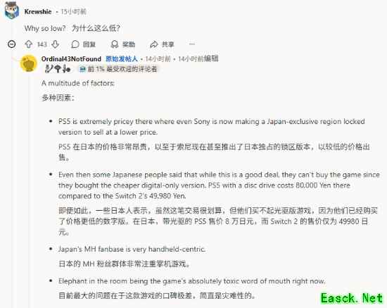 有网友问:为啥这么便宜啊?其他人一条一条分析起了目前的主机游戏市场和索尼的战略,但显而易见的最大原因是: