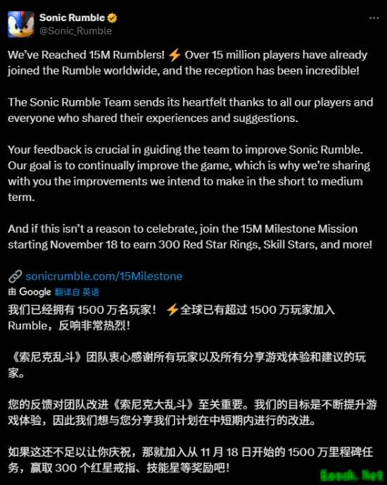 近日《索尼克Rumble》官方在社交媒体宣布,本作全球玩家数量现已超过1500万!“团队衷心感谢所有玩家以及所有分享游戏体验和建议的朋友们。”