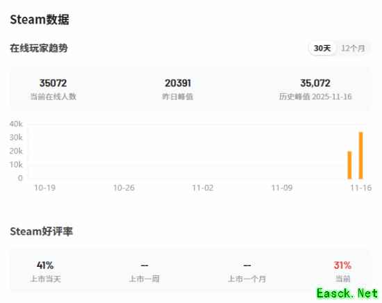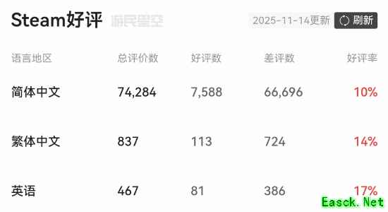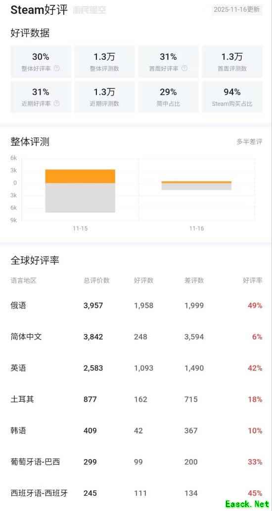 据我站的数据显示,《逃离塔科夫》在Steam平台的简体中文区评价为“差评如潮”,好评率跌至6%,总好评率从41%跌至31%。作为对比,《三国杀》简中好评率和整体为10%。