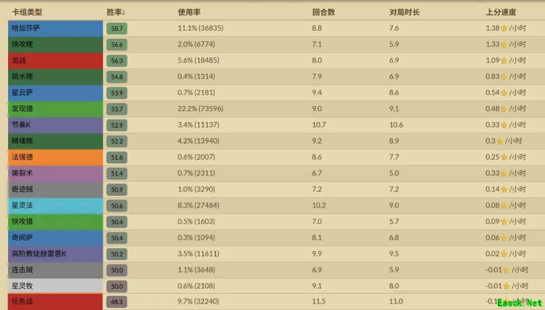平衡补丁第三天,王朝彻底更迭了,术士和盗贼陨落到胜率垫底了,新四巨头,中速萨、发现猎、星灵法、战士(龙战+任务战)。