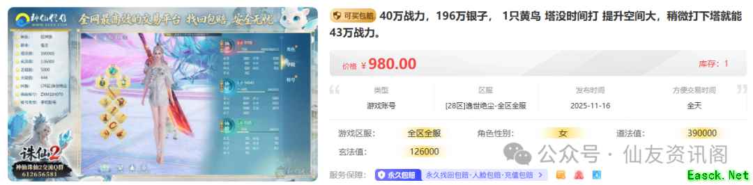 诛仙世界:《诛仙2》28区70级鬼王成品号,980可拿下,含196万银子 + 黄鸟~